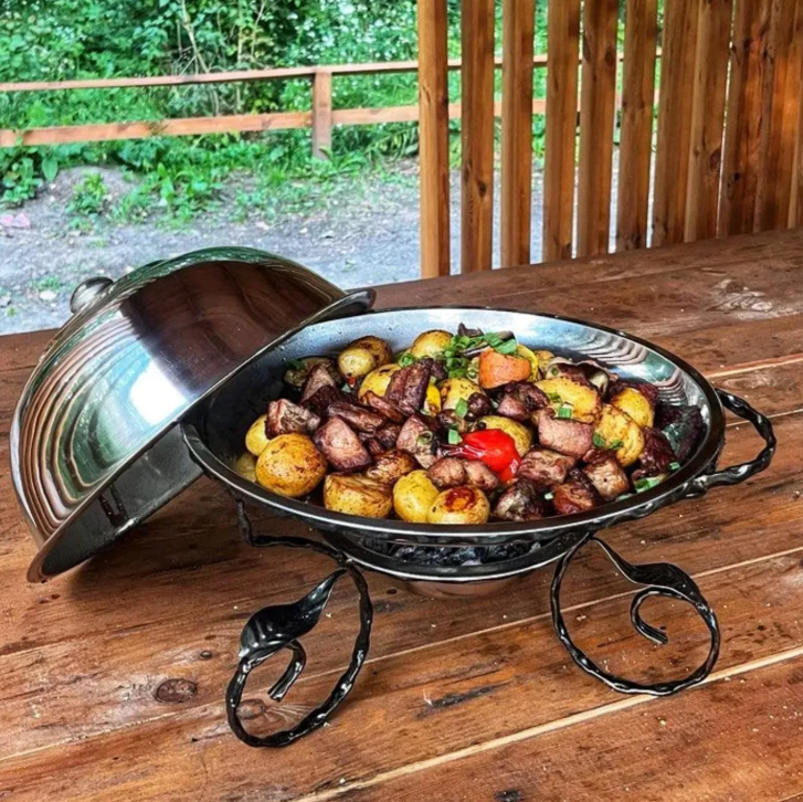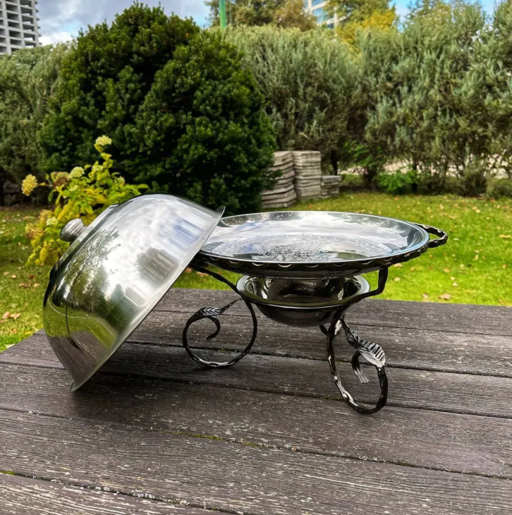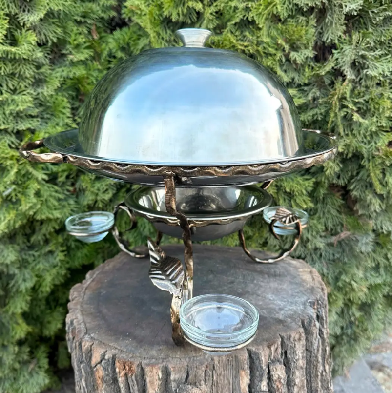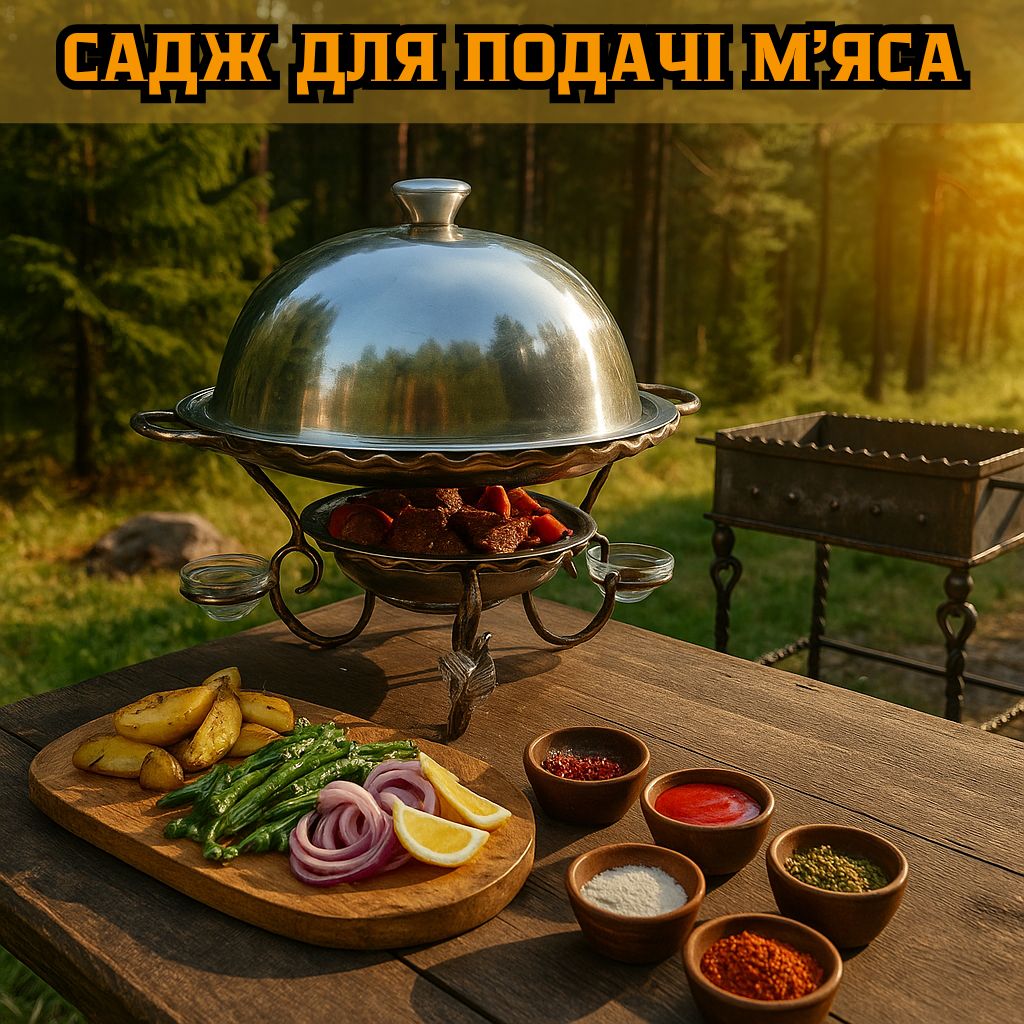 - Зберігає тепло страви – завдяки можливості підігріву вуглями, м’ясо довше залишається гарячим;